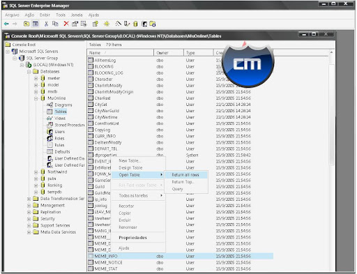 01 - Abra o SQL Entrepise Manager, Databases, MuOnline, Tables.